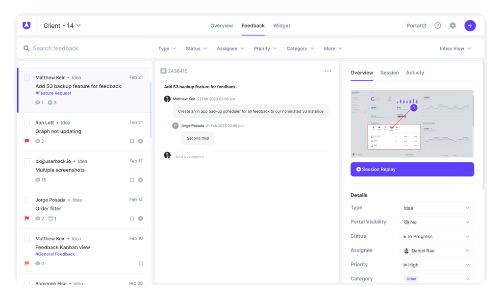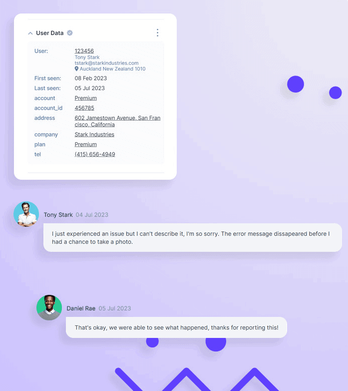 Userbackโs session replays give you the backstory behind every issue and feature request by automatically record user events, to get a deeper understanding of both site performance and user behavior.